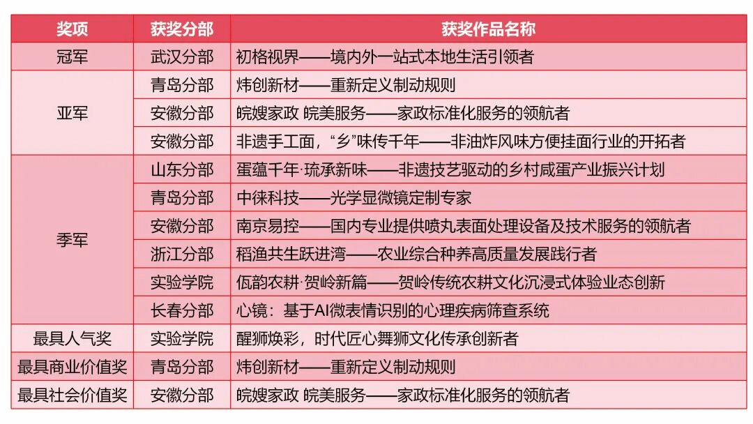 经过激烈角逐,本届共有19支队伍进入现场赛。现场赛包含半决赛、决赛两个环节,评审专家从个人成长、项目创新、产业价值、团队合作及现场表现等5个方面对参赛作品进行评分。最终,来自武汉分部的作品获得冠军,来自青岛分部、安徽分部的作品获得亚军,来自山东分部、青岛分部、安徽分部、浙江分部、国家开放大学实验学院、长春分部的作品获得季军。大赛还评出了最具人气奖、最具商业价值奖和最具社会价值奖等奖项。