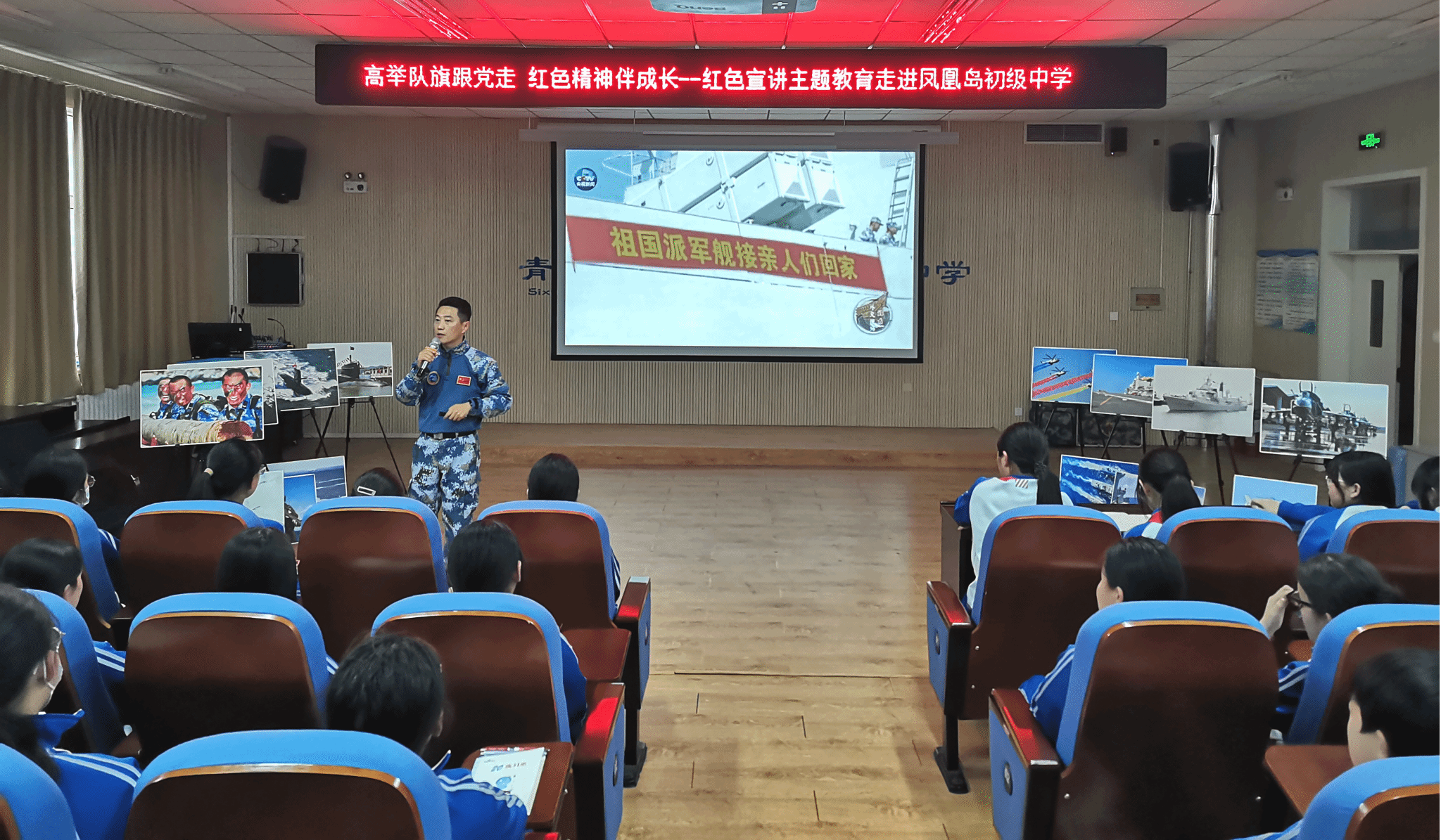 宣讲团教师以时间为线索,讲述1949年至今我国海军军事国防事业的发展历程,从“辽宁舰”到自主建造“山东舰”“福建舰”,通过鲜活的故事和震撼的视频,生动呈现了中国海军从无到有、从弱到强的辉煌历程以及中国航空母舰的崛起之路,让学生们仿佛置身于历史现场,直观地感受到祖国海军的强大力量。