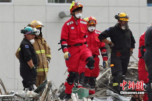 2011年2月26日,新西兰克莱斯特彻奇,中国救援队在CTV大楼展开救援工作。除废墟清理工作外,中国救援队还将利用生命探测设备搜寻幸存者。