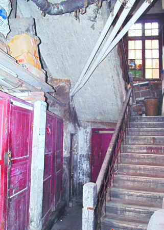 在这座位于天津路与河南路交会处的老建筑里,记者遇到了58岁的老住户杨子文。他3岁时就搬到这里住了,“这个房子的天井是银行的大厅,顶部还是玻璃吊顶,院里铺的是大理石,非常漂亮。”老人告诉记者,玻璃吊顶因年久失修而拆除,天井里还加盖了很多大大小小的房子,阳台等处甚至长出了荒草。