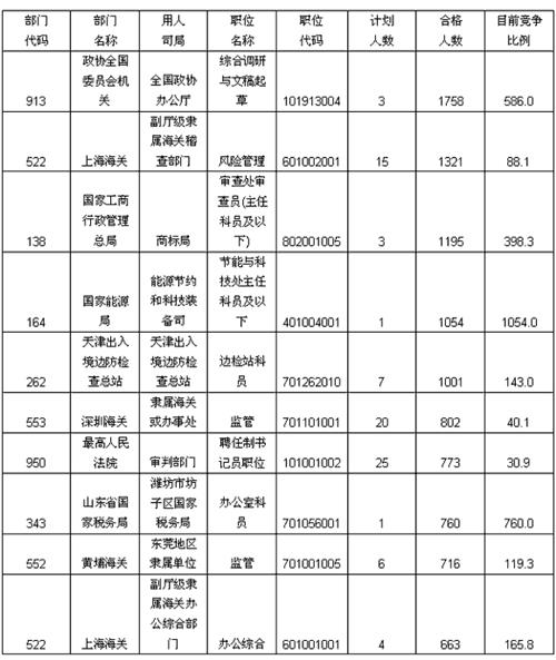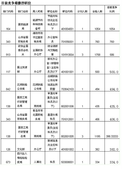 到目前为止,竞争最为激烈的前两个职位是国家能源局能源节约和科技装备司节能与科技处主任科员及以下和山东省国家税务局潍坊市坊子区国家税务局办公室科员。其中国家能源局能源节约和科技装备司节能与科技处主任科员竞争比列突破千人。