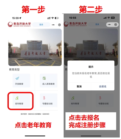 新学员 请点击【老年教育】后填写个人信息报名课程