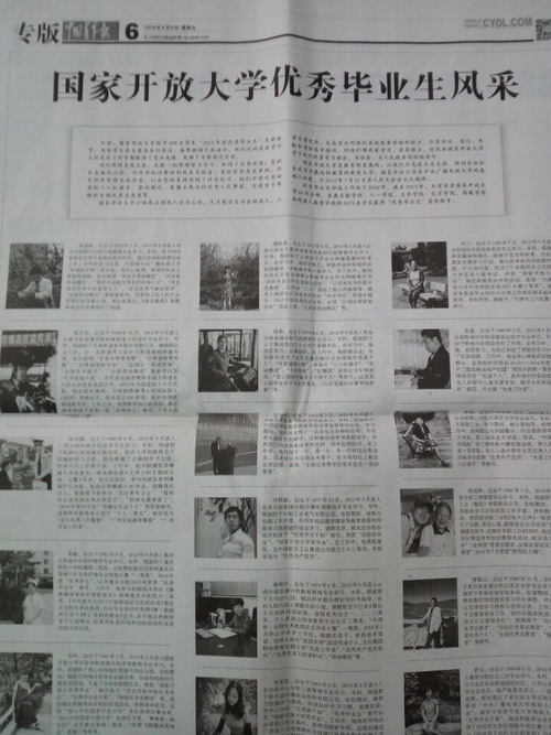 年报》2016年9月9月第六版整版报道了国家开放大学2015年优秀毕业生风采,其中我校张莉同学的事迹在列。张莉是我校2015年优秀毕业生中的一员。