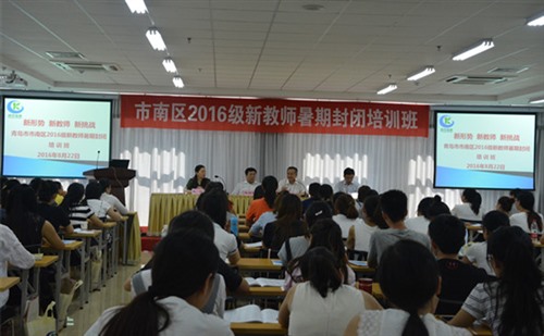 8月22日上午,青岛市市南区2016级新教师暑期封闭培训班在我校隆重举行开班仪式。我校校长张锡科、市南区教体局局长赵辉、市南区教育中心主任王红等相关领导,以及今年市南区新考录的121位新教师出席了开班仪式。