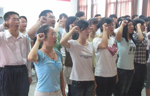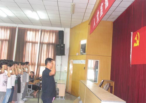会上,新入党的预备党员在党旗前庄严宣誓。2008年度青岛市优秀共产党员、学生处处长孙丽青代表教工党员发言,孔祥栋代表新党员发言。
